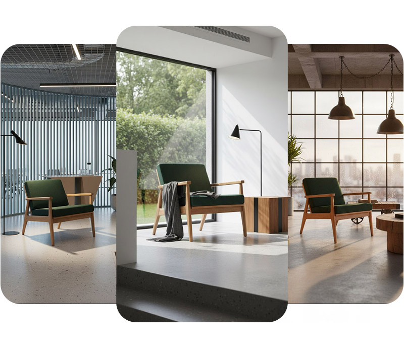 We know how painful it can be to find the perfect prompt. You don’t have to type a single word — forget about describing what you want in the video. We’ve already done the work for you. All interiors and decorations are carefully designed by us, focusing on editorial look, so your furniture looks its absolute best.